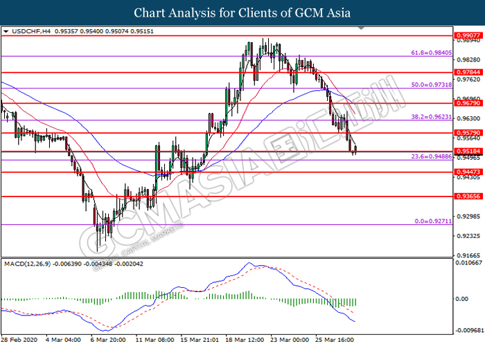 USDCHF, H4: USDCHF was traded lower while currently testing the support level at 0.9520. MACD which illustrate bearish bias signal suggest the pair to extend its losses after it successfully breakout below the support level at 0.9520.