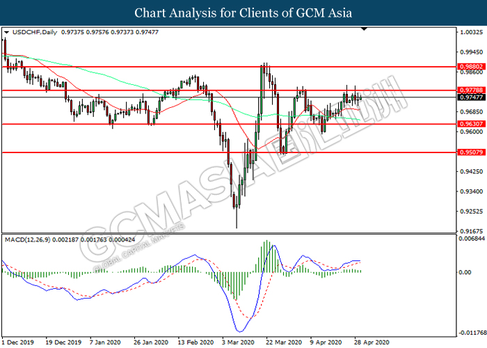 USDCHF, Daily: USDCHF was traded higher while currently testing the resistance level at 0.9780. However, MACD which illustrated diminishing bullish momentum suggest the pair to be traded lower in short-term as technical correction.