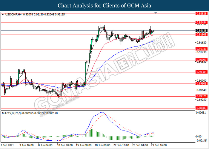 USDCHF, H4: USDCHF was traded higher following prior rebound from the support level 0.9195. MACD which illustrate bullish momentum signal suggest the pair to extend its gains towards the resistance level 0.9245.
