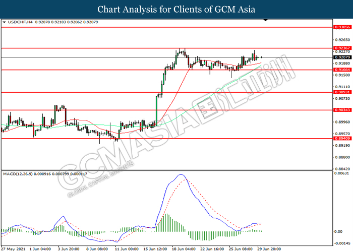 USDCHF, H4: USDCHF was traded higher while currently testing the resistance level at 0.9235. However, MACD which illustrated diminishing bullish momentum suggest the pair to be traded lower in short-term as technical correction.