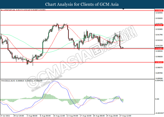 USDCHF, H4: USDCHF was traded lower while currently testing the support level at 0.9105. MACD which illustrated increasing bearish momentum suggest the pair to extend its losses after it successfully breakout below the support level.