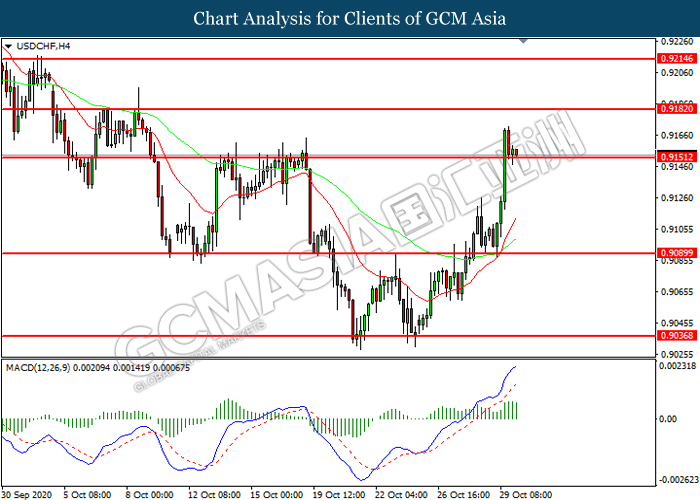 USDCHF, H4: USDCHF was traded lower while currently testing the support level at 0.9150. MACD which illustrated diminishing bullish momentum suggest the pair to extend its losses after it successfully breakout below the support level.
