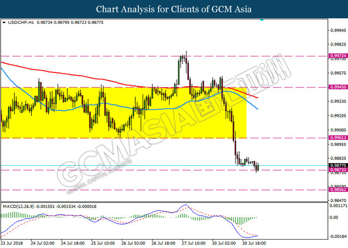 USDCHF, H1: USDCHF was traded lower while currently testing the support level 0.9875. MACD which illustrate bullish bias with golden cross formation suggest the pair may experience a short term technical correction towards resistance level 0.9900.