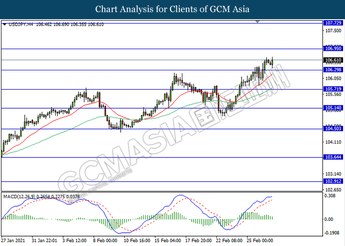 USDJPY, H4: USDJPY was traded higher following recent breakout above the previous resistance level 106.30. However, MACD which illustrate diminishing bullish momentum signal suggest the pair to experience a short-term technical correction back towards the level.