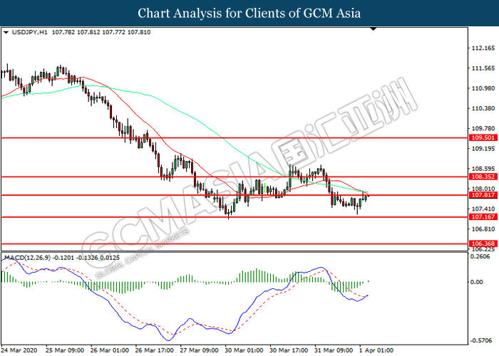 USDJPY, H1: USDJPY was traded higher while currently testing the resistance level at 107.80. MACD which illustrated diminishing bearish momentum suggest the pair to extend its gains after it successfully breakout above the resistance level.