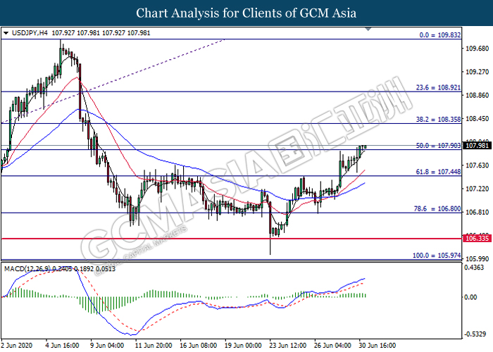 USDJPY, H4: USDJPY was traded higher following prior breakout above the previous resistance level at 107.90. MACD which illustrate bullish bias momentum signal suggest the pair to extend its gains toward the resistance level at 108.35.