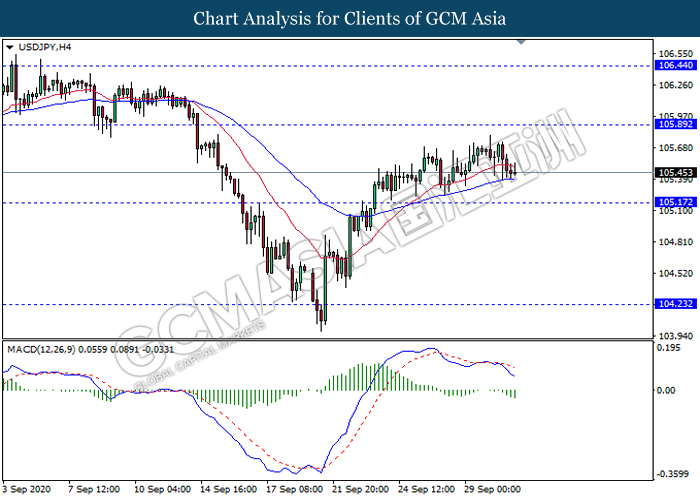 USDJPY, H4: USDJPY was traded lower following prior retracement from its high level. MACD which illustrate bearish momentum signal suggest the pair to extend its losses towards the support level 105.15.
