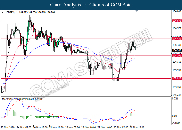 USDJPY, H1: USDJPY was traded lower following prior retracement from the resistance level at 104.40. MACD which illustrate diminishing bullish momentum signal suggest the pair to extend its losses toward the support level at 104.20.