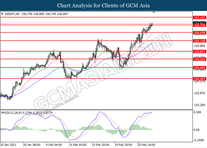 USDJPY, H4: USDJPY was traded higher while currently testing the resistance level at 106.75. However, MACD which illustrated diminishing bullish momentum signal suggest the pair to undergo technical correction in short term.