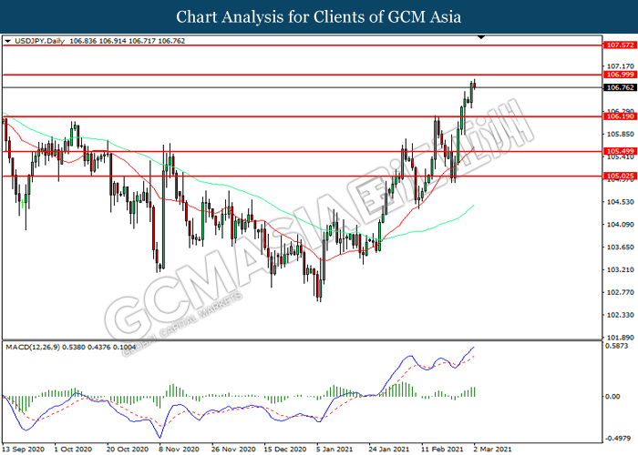 USDJPY, Daily: USDJPY was traded higher while currently testing the resistance level at 107.00. MACD which illustrated increasing bullish momentum suggest the pair to extend its gains after it successfully breakout above the resistance level.