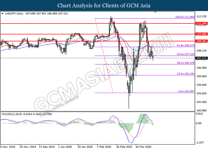 USDJPY, Daily: USDJPY was traded lower while currently testing the support level at 107.55. MACD which illustrate bearish momentum signal suggests the pair to extend its losses after it successfully breakout below the support level at 107.55.