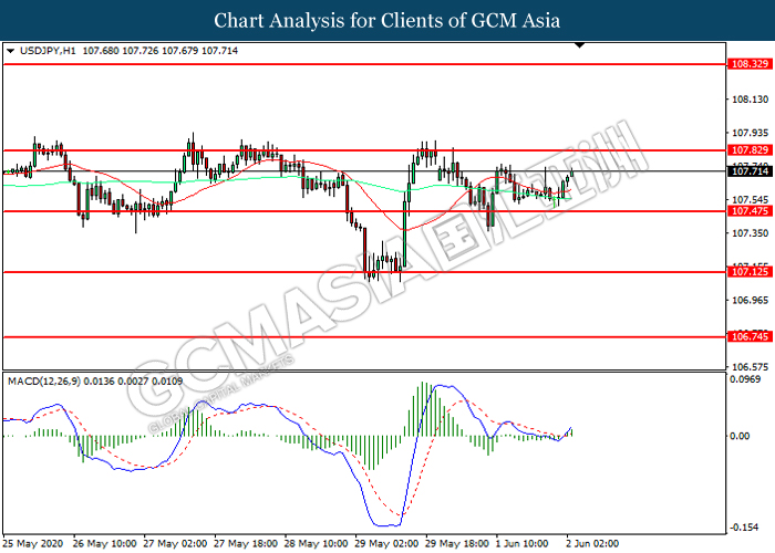 USDJPY, H1: USDJPY was traded higher following prior rebound from the support level at 107.45. MACD which illustrated increasing bullish momentum suggest the pair to extend its gains toward resistance level at 107.85.