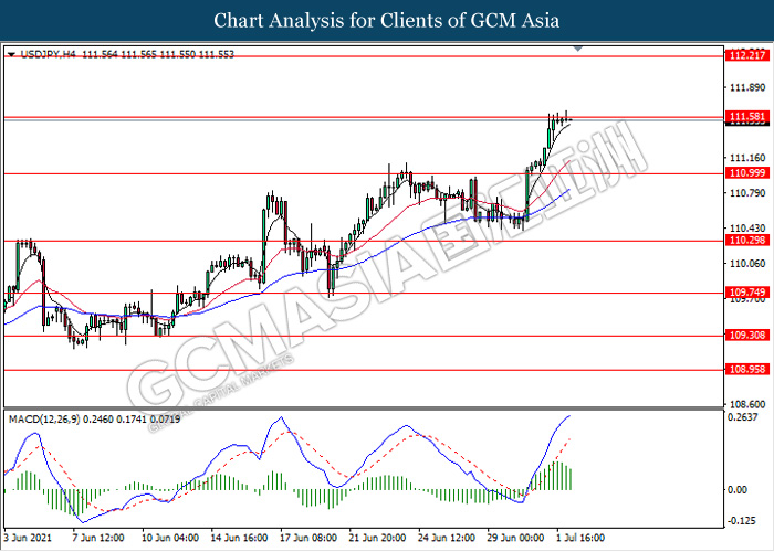 USDJPY, H4: USDJPY was traded higher while currently testing the resistance level 111.60. However, MACD which illustrate diminishing bullish momentum signal suggest the pair to experience a technical correction towards the support level 111.00.