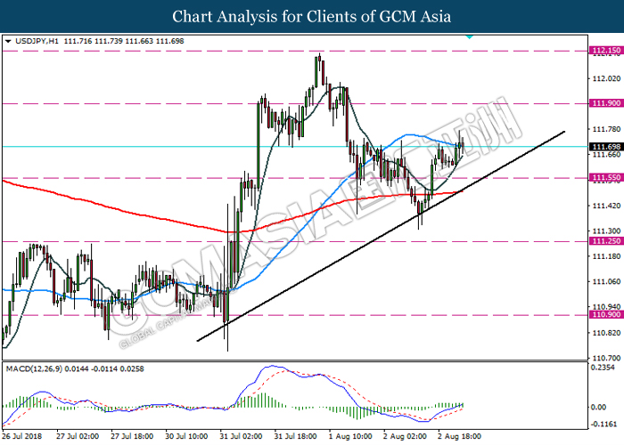 USDJPY, H1: USDJPY was traded higher following recent breakout above the resistance level 111.55. MACD which display bullish signal with golden cross formation suggest the pair may extend its gains toward resistance level 111.90.