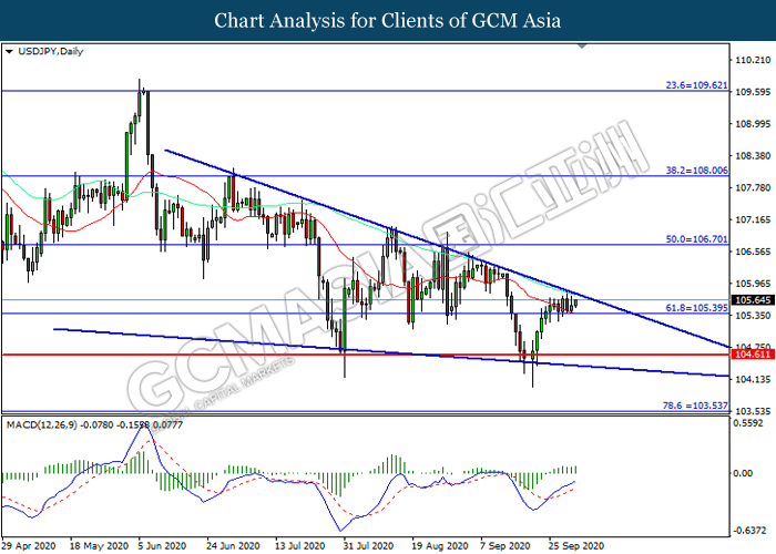USDJPY, Daily: USDJPY was traded higher following prior rebound from the support level at 105.40. MACD which illustrated increasing bullish momentum suggest the pair to extend its gains toward resistance level at 106.70.