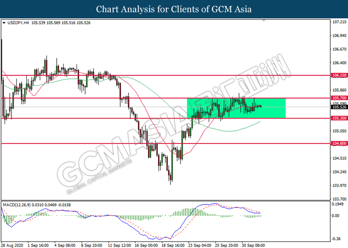 USDJPY, H4: USDJPY remains traded within a sideways channel. Due to the lack of signal from MACD and price action, it is suggested to wait for a breakout before entering the market.