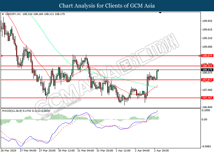 USDJPY, H1: USDJPY was traded higher following prior rebound from the support level at 107.80. MACD which illustrated increasing bullish momentum suggest the pair to extend its gains toward resistance level at 108.30.