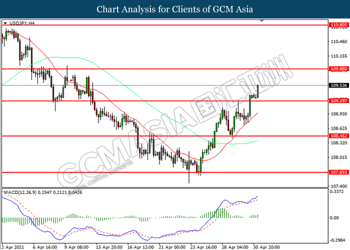 USDJPY, H4: USDJPY was traded higher following prior breakout above the previous resistance level at 109.20. MACD which illustrated increasing bullish momentum suggest the pair to extend its gains toward resistance level at 109.90.