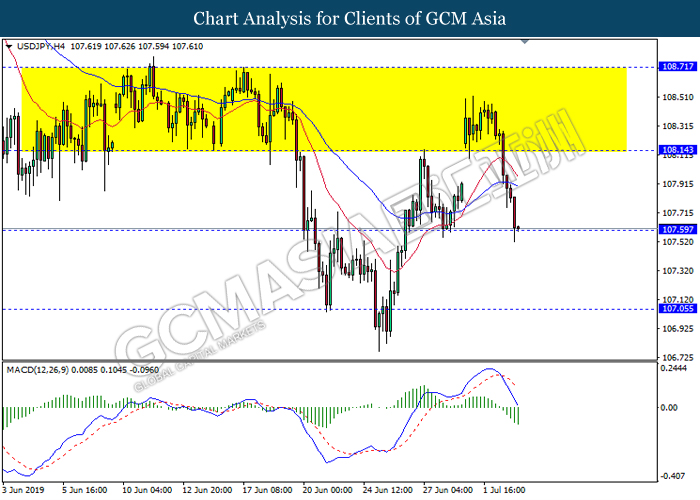 USDJPY, H4: USDJPY was traded lower while currently testing the support level 107.60. MACD which illustrate bearish momentum signal with the formation of death cross suggest the pair to extend its losses after it breaks below the support level.