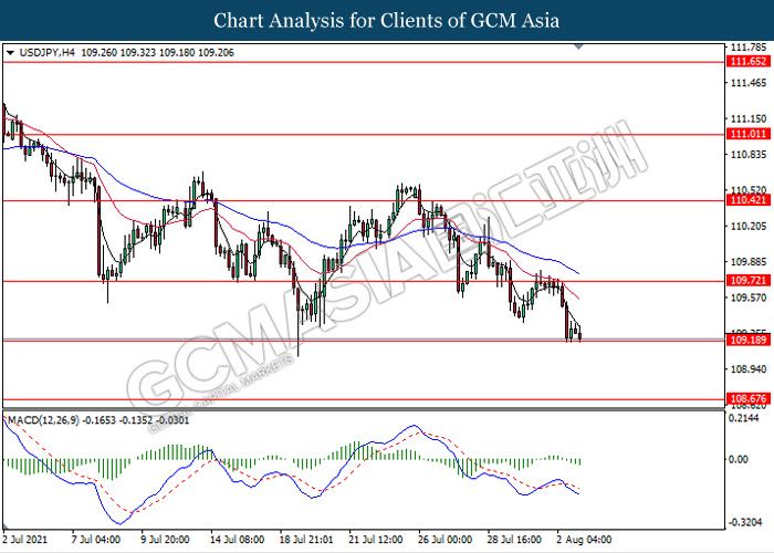 USDJPY, H4: USDJPY was traded lower while currently testing the support level 109.20. MACD which illustrate bearish momentum signal suggest the pair to extend its losses after it breaks below the support level.