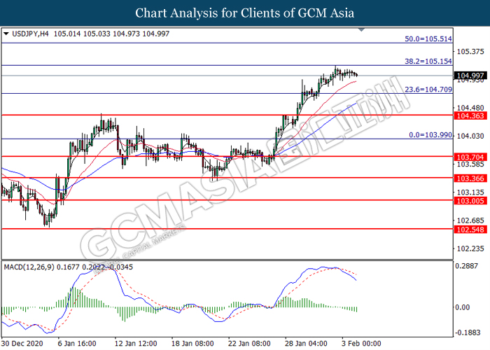 USDJPY, H4: USDJPY was traded lower following prior retracement from the resistance level at 105.15. MACD which illustrated bearish bias momentum suggest the pair to extend its losses toward the support level at 104.70.