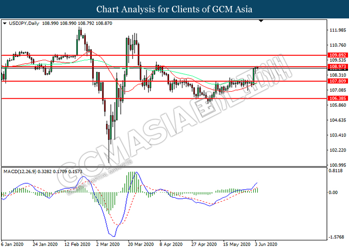 USDJPY, Daily: USDJPY was traded higher while currently testing the resistance level at 108.95. MACD which illustrated increasing bullish momentum suggest the pair to extend its gains after it successfully breakout above the resistance level.