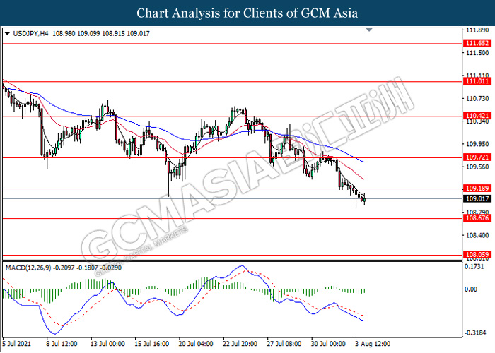 USDJPY, H4: USDJPY was traded lower following prior breakout below the previous support level 109.20. MACD which illustrate bearish bias signal suggest the pair to extend its losses towards the support level 108.65.