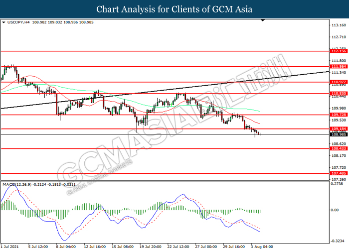 USDJPY, H4: USDJPY was traded lower following prior breakout below the previous support level at 109.20. MACD which illustrated increasing bearish momentum suggest the pair to extend its losses toward support level at 108.45.