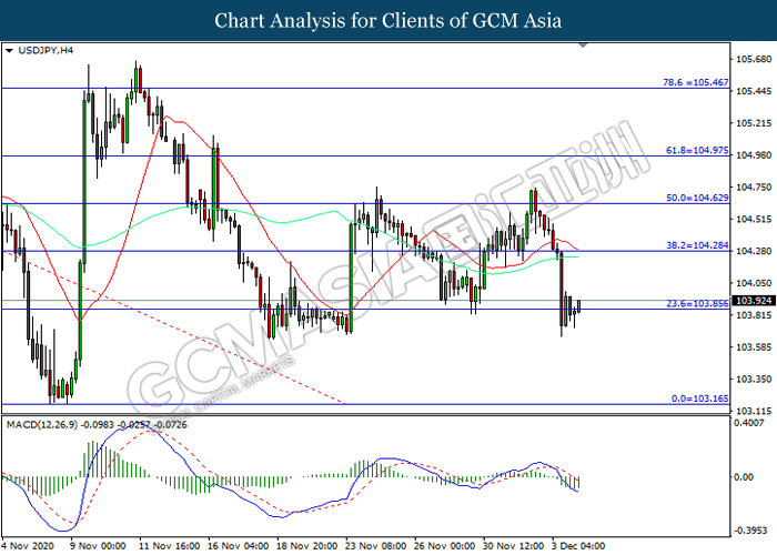 USDJPY, H4: USDJPY was traded lower while currently testing the support level at 103.85. MACD which illustrated increasing bearish momentum suggest the pair to extend its losses after it successfully breakout below the support level.