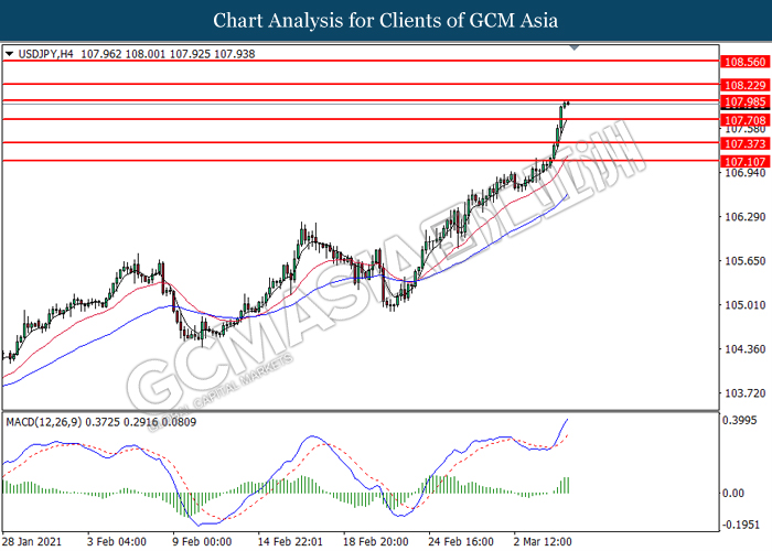 USDJPY, H4: USDJPY was traded higher while currently testing the resistance level at 108.00. MACD which illustrated bullish bias momentum signal suggest the pair to extend its gains after it successfully breakout above the resistance level.