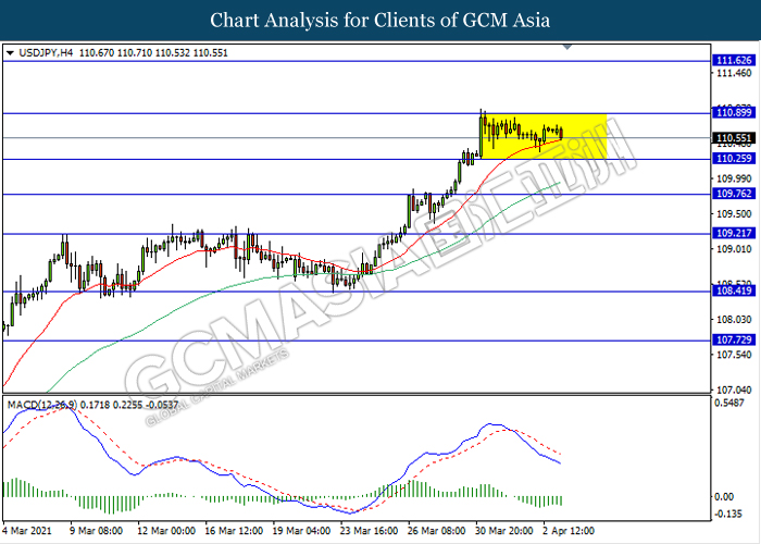 USDJPY, H4: USDJPY remain traded in a sideway channel. However, MACD which illustrate bearish momentum signal suggest the pair to be traded lower in short term towards the support level 110.25.