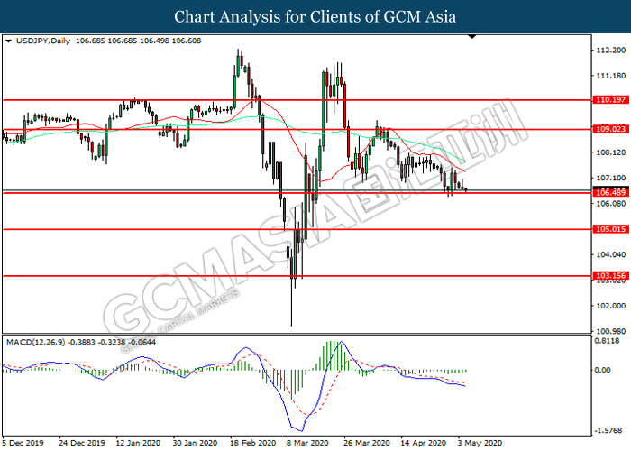 USDJPY, Daily: USDJPY was traded lower while currently testing the support level at 106.50. However, MACD which illustrated diminishing bearish momentum suggest the pair to be traded higher in short-term as technical correction.