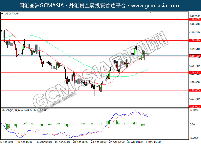USDJPY, H4: USDJPY was traded lower while currently testing the support level at 109.20. MACD which illustrated increasing bearish momentum suggest the pair to extend its losses after it successfully breakout below the support level.