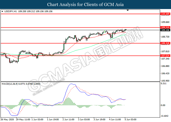 USDJPY, H1: USDJPY was traded higher while currently testing the resistance level at 109.30. MACD which illustrated increasing bullish momentum suggest the pair to extend its gains after it successfully breakout above the resistance level.