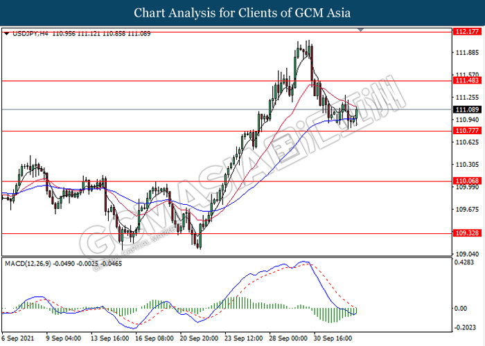 USDJPY, H4: USDJPY was traded higher following prior rebound from the support level 110.75. MACD which illustrate diminishing bearish momentum signal suggest the pair to extend its rebound towards the resistance level 111.50.