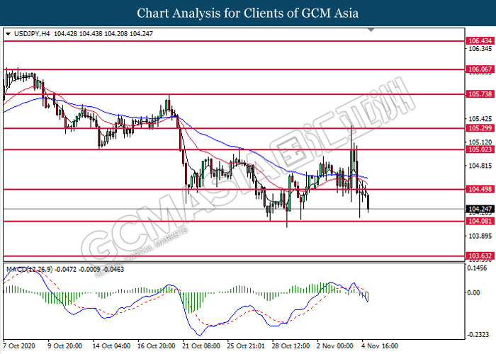 USDJPY, H4: USDJPY was traded lower following prior breakout below the previous support level at 104.50. MACD which illustrate bearish momentum signal suggest the pair to be traded lower toward the support level at 104.10.