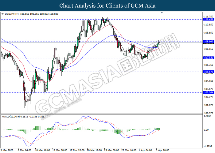 USDJPY, H4: USDJPY was traded higher while currently testing the resistance level at 108.95. MACD which illustrate persistent bullish momentum signal suggest the pair to extend its gain after it breaks above the resistance level.
