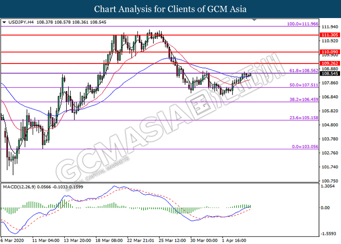 USDJPY, H4: USDJPY was traded higher while currently testing the resistance level at 108.55. MACD which illustrate bullish bias momentum signal suggests the pair to extend its gains after it successfully breakout above the resistance level.