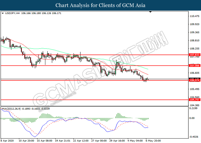 USDJPY, H4: USDJPY was traded lower while currently testing the support level at 106.05. However, MACD which illustrated diminishing bearish momentum suggest the pair to be traded higher in short-term as technical correction.