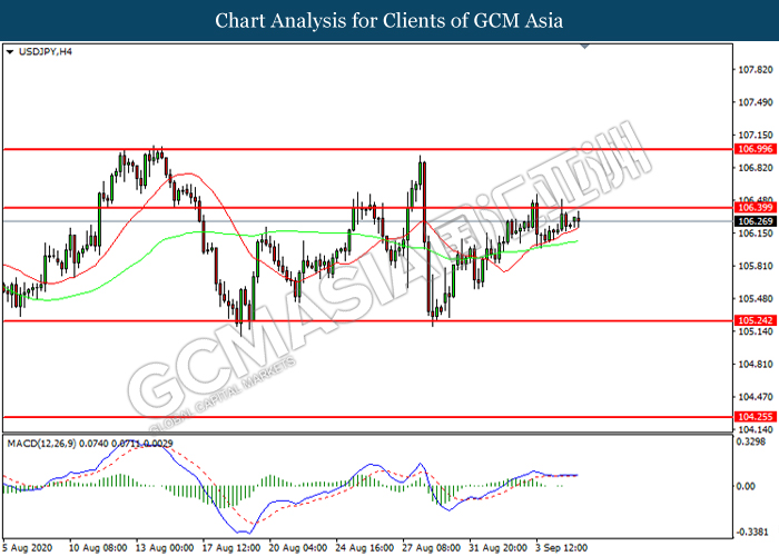 USDJPY, H4: USDJPY was traded higher while currently testing the resistance level at 106.40. However, MACD which illustrated diminishing bullish momentum suggest the pair to be traded lower in short-term as technical correction.