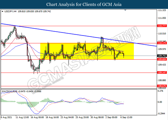USDJPY, H4: USDJPY remain traded in a sideway channel while currently testing near the support level 109.60. However, MACD which illustrate bearish bias signal suggest the pair to extend its losses after it breaks below the support level.