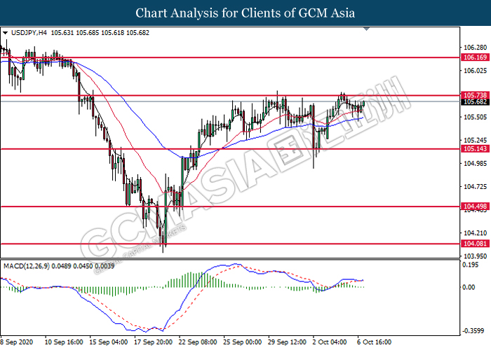 USDJPY, H4: USDJPY was traded higher following prior rebound from the lower level. MACD which illustrate bullish signal suggest the pair to extend its gains toward the resistance level at 105.75.
