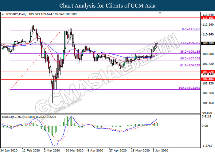USDJPY, Daily: USDJPY was traded higher following prior breakout above the previous resistance level at 109.40. MACD which illustrate bullish bias momentum signal suggest the pair to extend its gains toward the resistance level at 111.35.