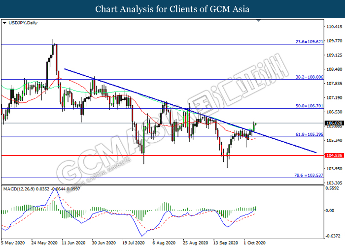 USDJPY, Daily: USDJPY was traded higher following prior breakout above the previous resistance level at 105.40. MACD which illustrated increasing bullish momentum suggest the pair to extend its gains toward resistance level at 106.70.