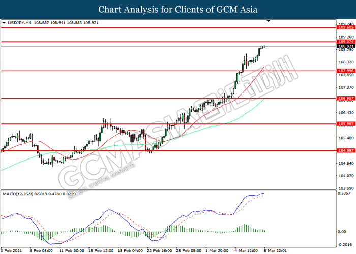 USDJPY, H4: USDJPY was traded higher while currently testing the resistance level at 109.05. MACD which illustrated diminishing bullish momentum suggest the pair to be traded lower in short-term as technical correction.