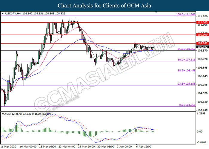USDJPY, H4: USDJPY was traded higher following prior rebound from the support level at 108.55. MACD which illustrate diminishing bearish momentum signal suggests the pair to extend its gains toward the resistance level at 109.25.