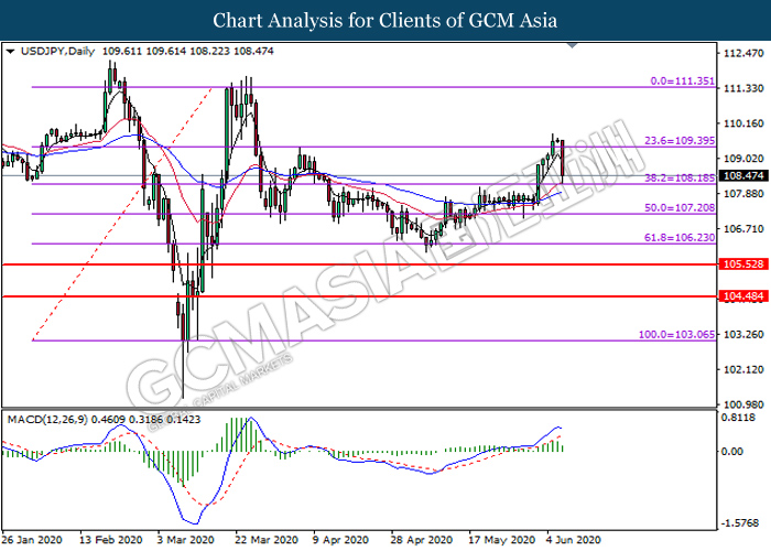 USDJPY, Daily: USDJPY was traded higher following prior retracement near the resistance level at 109.40. MACD which illustrate diminishing bullish momentum signal suggest the pair to extend its retracement toward the support level at 108.20.