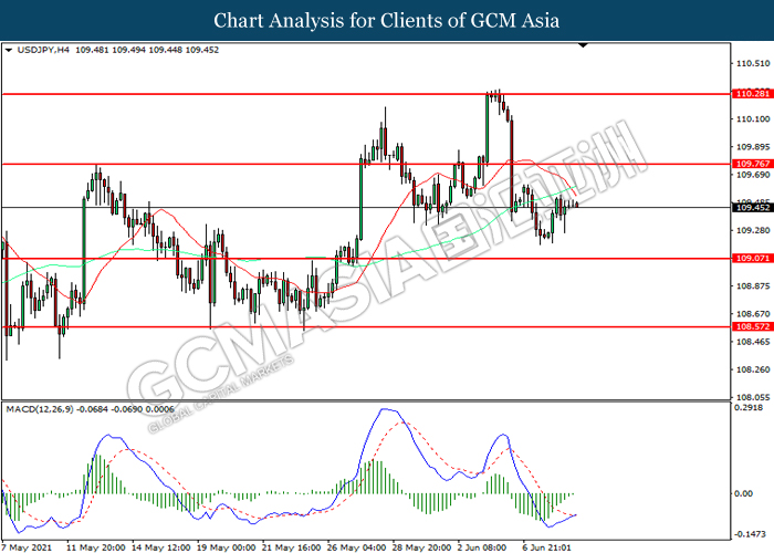 USDJPY, H4: USDJPY was traded higher following prior rebound from the support level at 109.05. MACD which illustrated diminishing bearish momentum suggest the pair to extend its gains toward resistance level at 109.75.