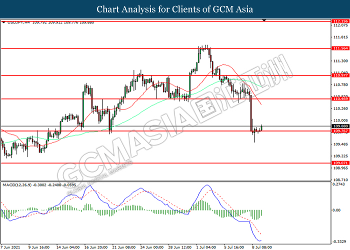 USDJPY, H4: USDJPY was traded lower while currently testing the support level at 109.75. However, MACD which illustrated diminishing bearish momentum suggest the pair to be traded higher in short-term as technical correction.