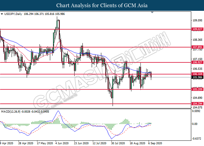 USDJPY, Daily: USDJPY was traded lower following prior rebound near the resistance level at 106.15. MACD which illustrates diminishing bullish momentum suggest the pair to extend its retracement toward the support level at 105.20.